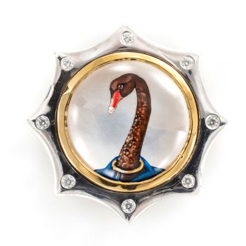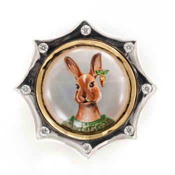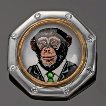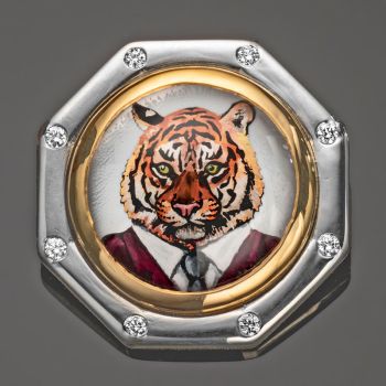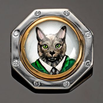 Rotenier, a classically trained French jewelry artist and designer who has painted fine art miniatures for decades, uses reverse carved rock crystal cabochons, providing the portraits with dimension and depth. The animal
