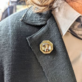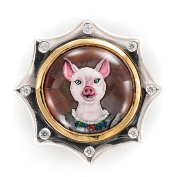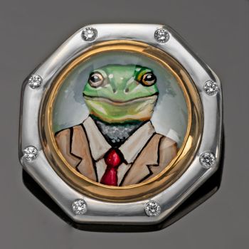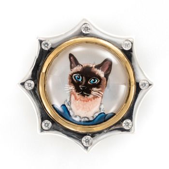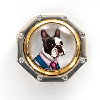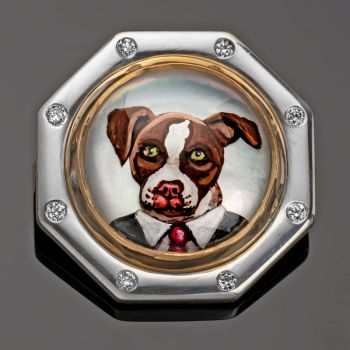 Rotenier’s RémanimalsTM brooches honor the Essex tradition. The portraits are framed in sterling silver set with diamonds, and given thick, 22k gold bezels. On the back, a baguette diamond is set (as the center of a dog bone for dog portraits). There’s also a round diamond set next to the artist’s signature, as a secret “wink” to the wearer.