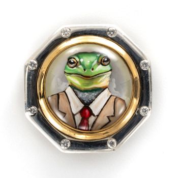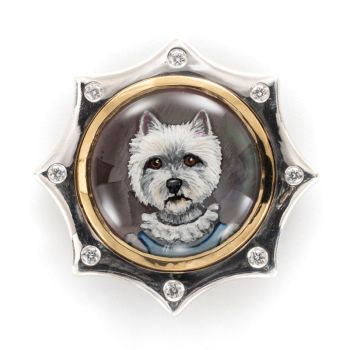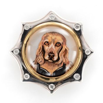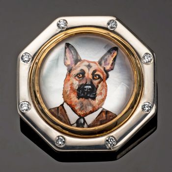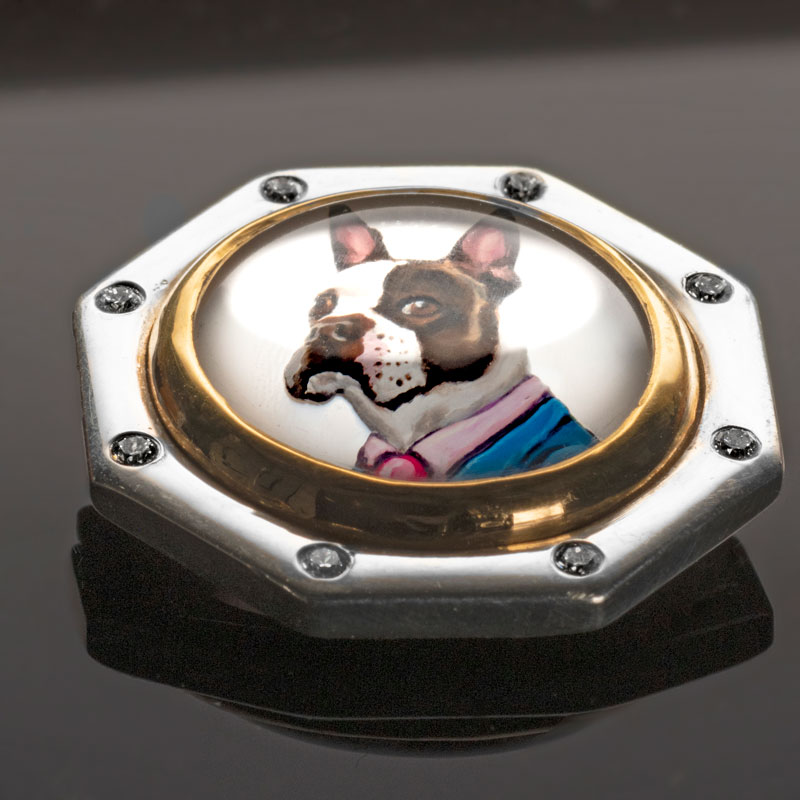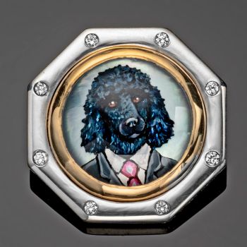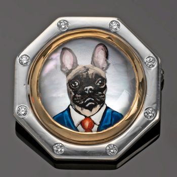 Rotenier’s RémanimalsTM brooches honor the Essex tradition. The portraits are framed in sterling silver set with diamonds, and given thick, 22k gold bezels. On the back, a baguette diamond is set (as the center of a dog bone for dog portraits). There’s also a round diamond set next to the artist’s signature, as a secret “wink” to the wearer.