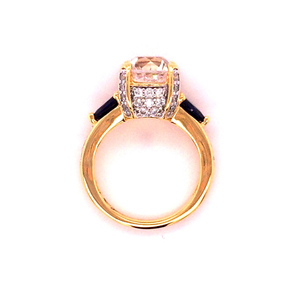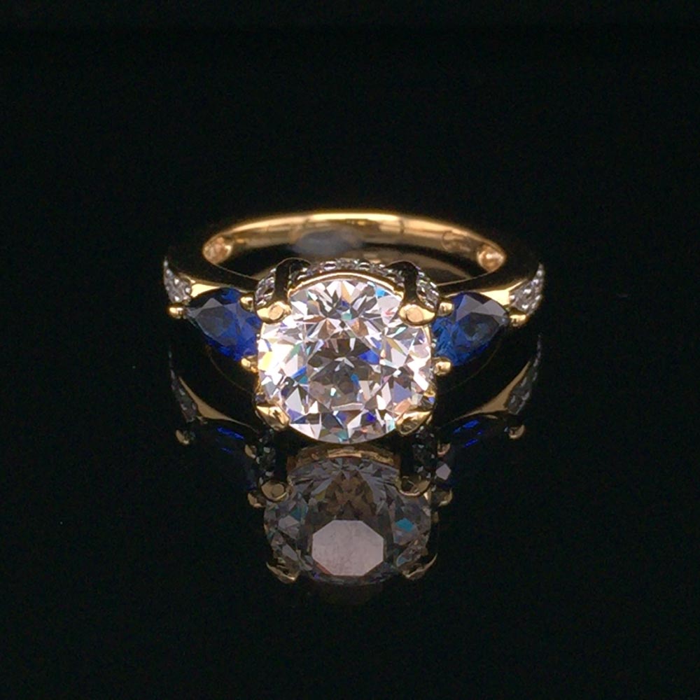 The center Rémy cut CZ is bright and sparkly, the prongs are pavé and the pear shape sapphires on the side make it stand out even more. This ring has a distinctive Parisian flair.