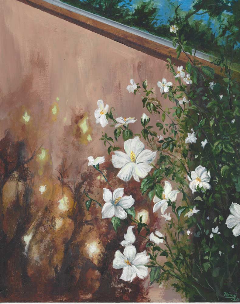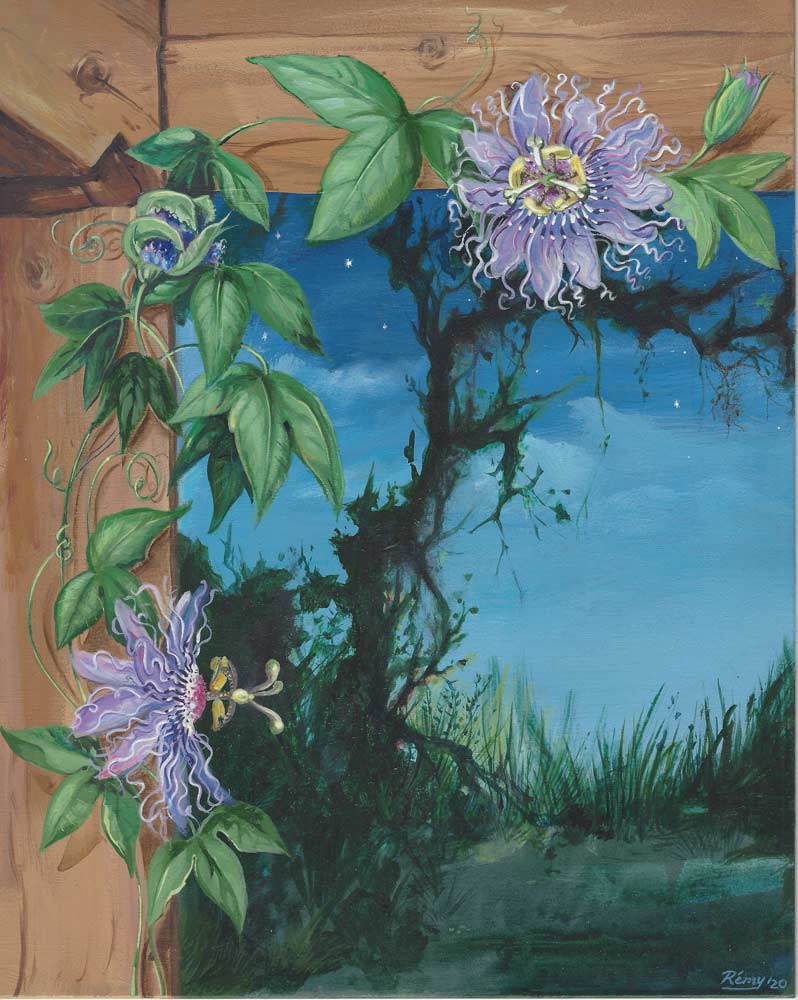 “I explore flowers as the precious wonders of our lives bursting with promise. The backgrounds represent the mystery and intrigue of the outside world.”