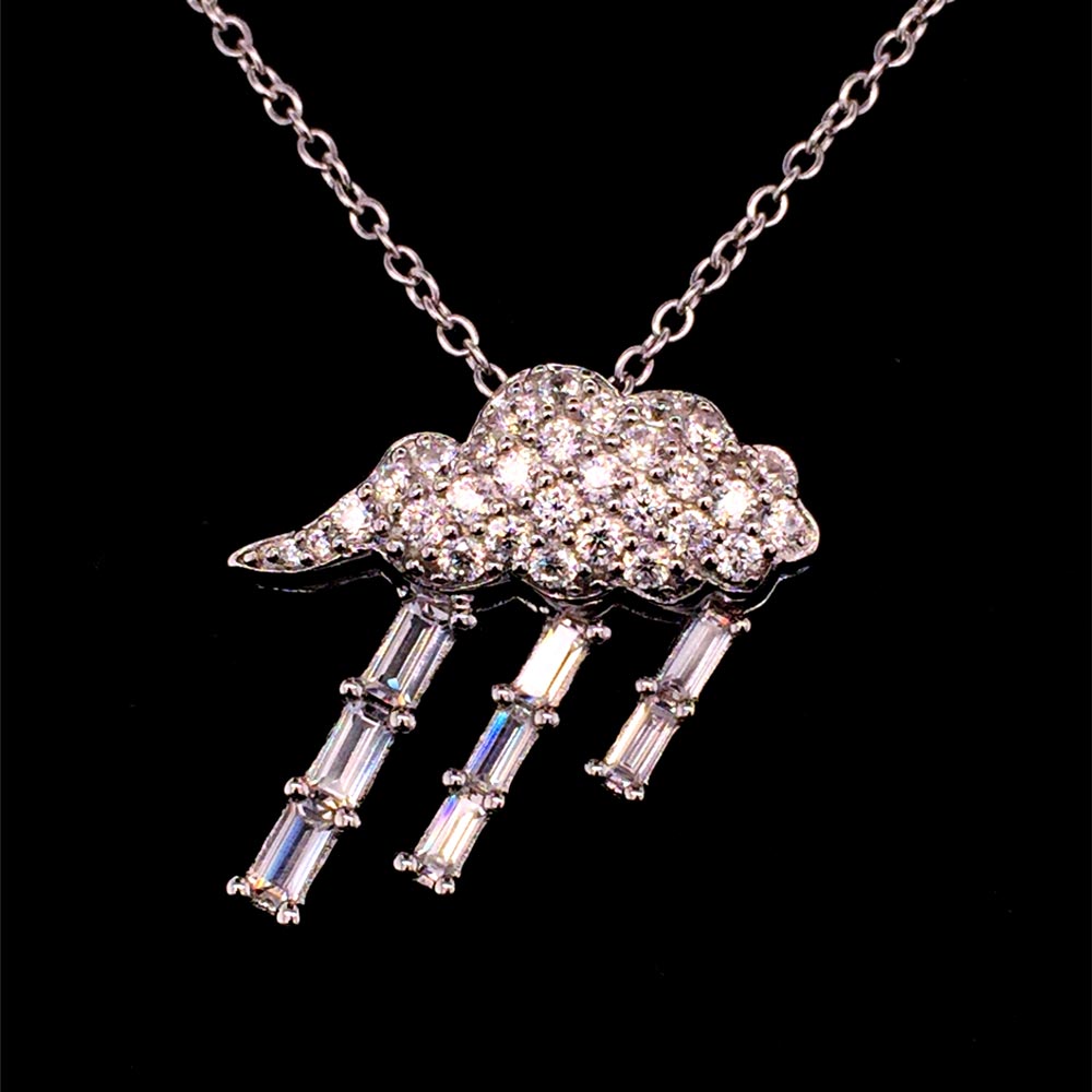I designed the Raincloud pendant because to me water symbolizes purification. Also living in the desert I appreciate rain way more than I did growing up in Paris! Ok I think it is really cute too with the clouds being classically pavé the rain as baguette CZs set diagonally!